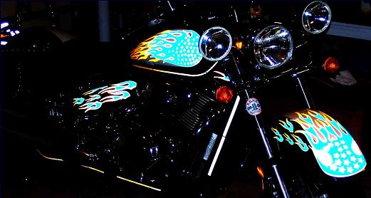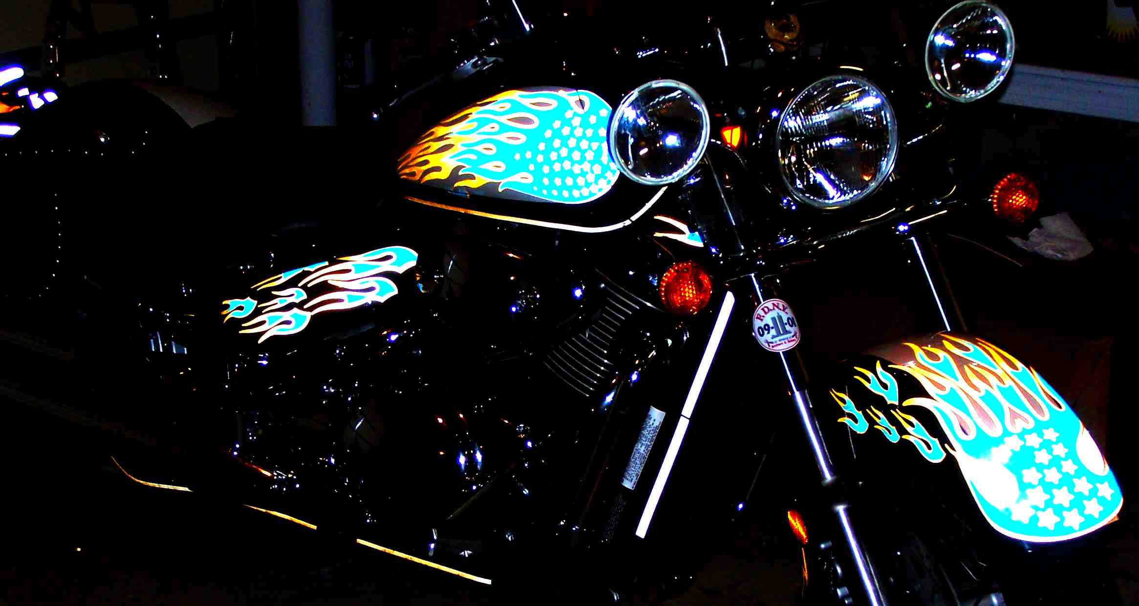 This image shows the American Tradition reflective decal kit as installed on our test and demo bike. This is just one f many ways to lay out this kit.