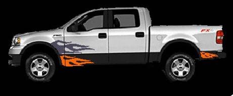 Streetglo's Flame Graphics Kit will fit all vehicles because it is a custom graphic ordered to size. Will fit all vehicles, imports, domestic, cars and trucks. Pictured here is Ford F150 truck. Each Car/Truck Graphics Kit contains 6 custom vehicle graphics as shown below for both sides of the vehicle. Kit can be order for matching style hood vehicle graphic flames as well. ( Ordering options include 1st color and 2nd color choice. You can order both the same color or specify different colors as required on the sample Ford F150 pictured below. Stock kit is non reflective but may be ordered in reflective